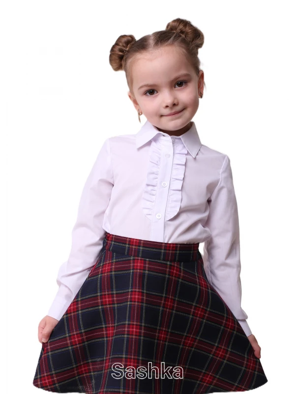 Злегка приталена блузка відрізняється ніжним дизайном, має білий колір - це дозволить створити милий образ вашої маленької учениці. Який би відтінок форми (спідниці, брюк і жакета) ви не вибрали, модель буде доречна з будь-яким варіантом. Напівприталена класична блузка з довгим рукавом виглядає лаконічно - буде доречна як на святковому заході в школі, так і при повсякденному носінні.