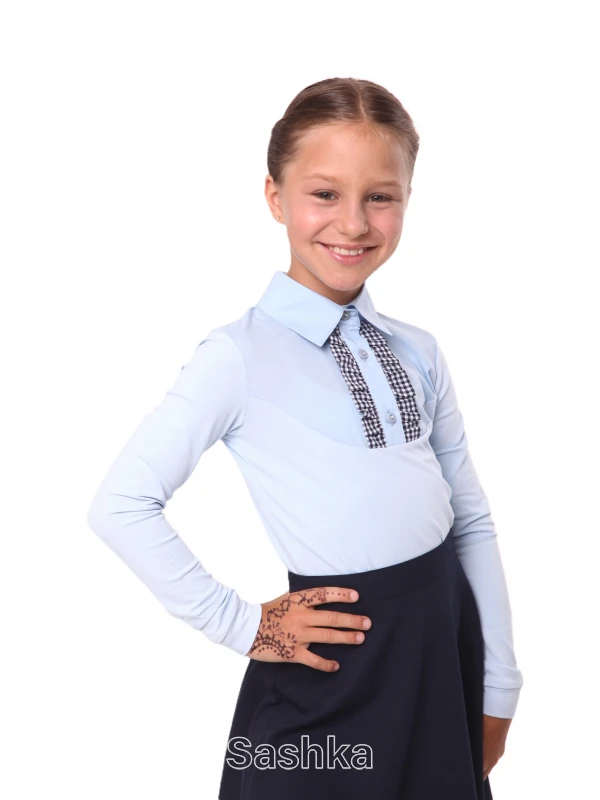 Блузка з трикотажу - це комфортна класика, яка не набридне навіть при частому носінні. Блуза поєднує діловий верх з гострим комірцем і м'яку трикотажну основну частину. Передня верхня частина виконана на кокетці з коміром і невеликим воланом уздовж застібки, яка надає виробу нарядності. Кокетка і комір виконані з бавовняної тканини. Блузка одягається через голову і застібається на 3 гудзики спереду. Виріб підходить в якості шкільної форми на зрост 116-146. Крім навчального закладу його можна надягати в гості, до подружок на дні народження і на звичайну прогулянку.