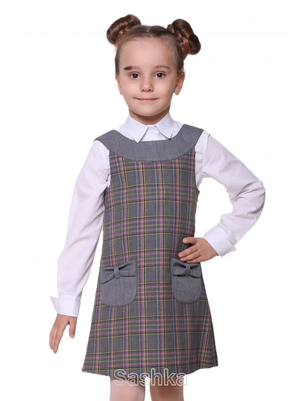 Якщо ви шукаєте елемент гардеробу для дівчинки, який буде виглядати святково і одночасно стримано, цей сарафан - те, що потрібно. Сіро-рожева велика клітинка «шотландка» - одне з найбільш популярних рішень для пошиття шкільної форми. Ми доповнили фасон акуратною темно-синьою круглою кокеткою і в тон їй двома накладними кишенями з бантами.
