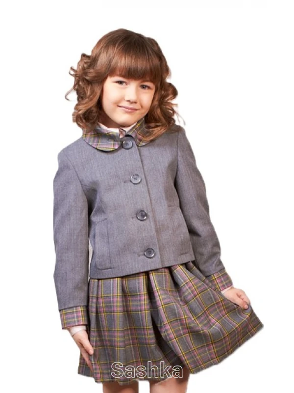 Укорочений жакет для дівчинки - відмінне доповнення модною шкільної форми. Виріб пошито з якісної напіввовни сірого кольору. Комір і манжети декоровані м'якою тканиною в сіро-рожеву клітинку. Жакет гармонійно поєднується з брюками або пишною спідницею. Можна його надіти і з джинсами для прогулянки в парку.