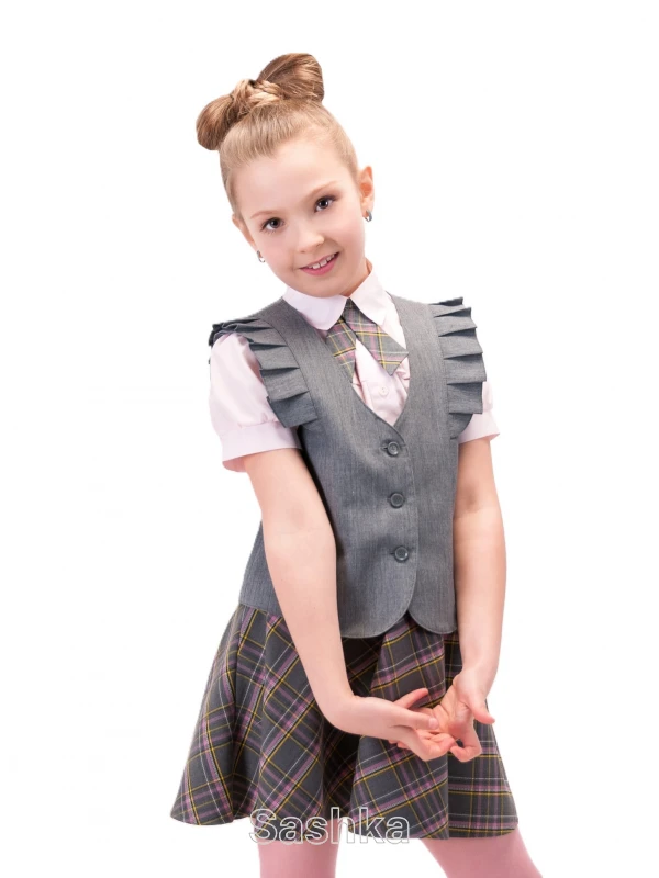 Жилет шкільний для дівчинки Sashka сірий (рюшки, напіввовна), розмір 116-146