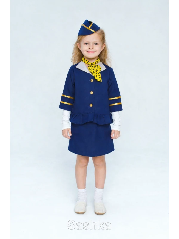 Створюючи костюм стюардеси, ми надихалися справжньою формою бортпровідниць. Класична уніформа передбачає наявність трьох елементів: білої блузки, жакету та спідниці прямого крою. Ми ж об'єднали все в один елемент – сукню – для того, щоб дитині та батькам було легше впоратися з вбранням та зібратися на свято. При цьому ми зберегли головні принципи небесної уніформи – естетичність, елегантність та зручність.