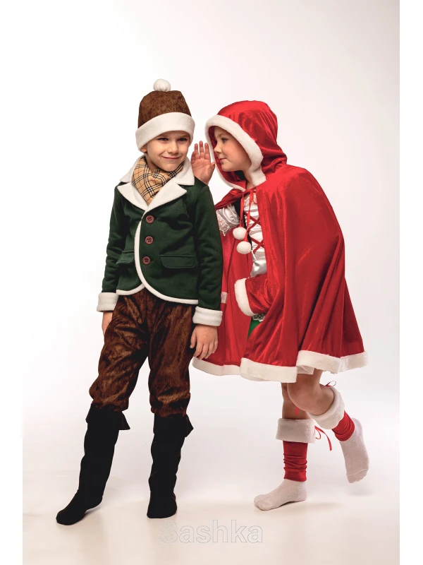 Накидка. Пошита з червоної велюрової тканини у вигляді плаща з капюшоном. Накидається на плечі та зав'язується під шиєю тонкою стрічкою з бубонами. Плащ декорований штучним білим хутром.