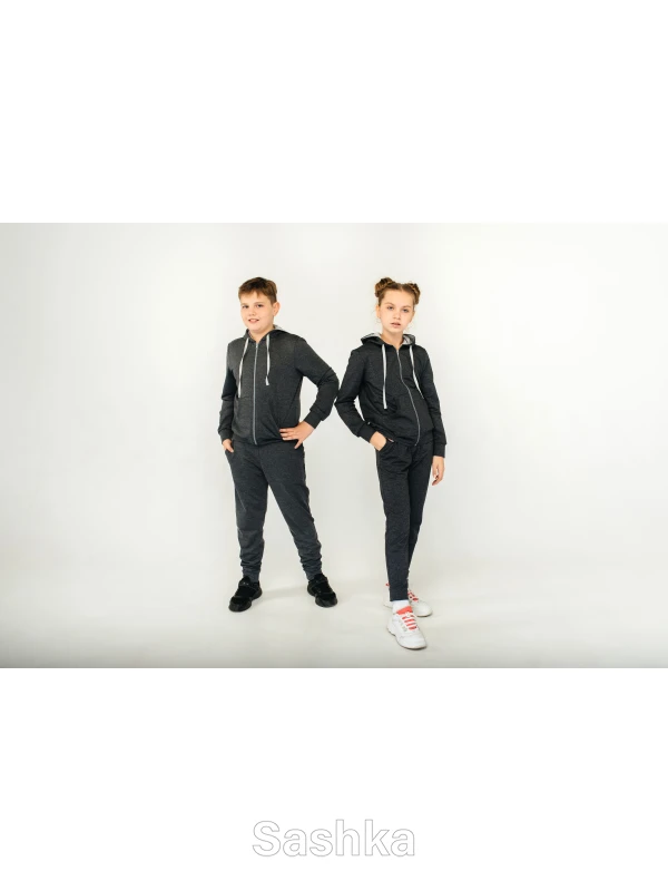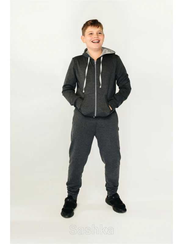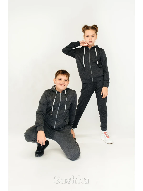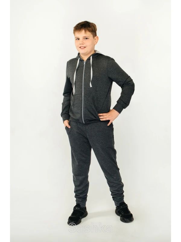 Трикотажний спортивний костюм підійде як для уроків фізкультури, так і для звичайних пробіжок або прогулянок на вулиці. Спортивний костюм повинен бути зручним, легким і немарким. Саме такими якостями володіє цей темно-сірий комплект, що складається з кофти і штанів.