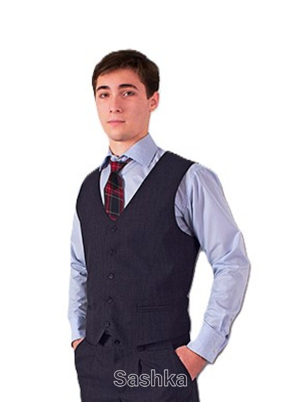 Класичний однобортний синій жилет покликаний урізноманітнити гардероб підлітка та сформувати у нього відчуття стилю. Але сучасні тенденції вийшли далеко за межі класики, і жилет можна сміливо носити без піджака, адже наш жилет виготовлений із повноцінною тканинною спинкою. Він чудово виглядає з однотонними білими та яскравими сорочками, і навіть підходить до сорочок з підкатаними рукавами. Такий стиль сучасні дизайнери називають смарт-кежуал. Єдине правило – штани та жилет не повинні бути в одному тоні. Поєднання такого верху з джинсами допустиме і навіть вітається.