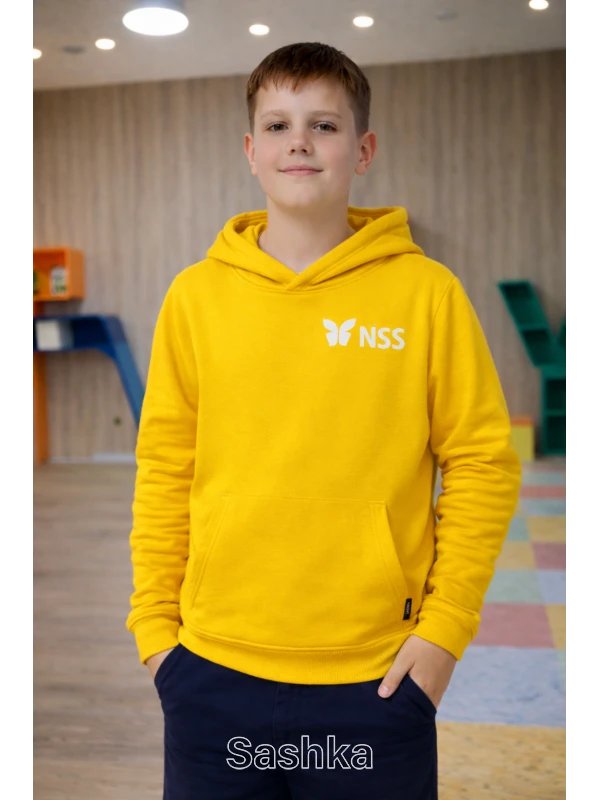 Худі УТЕПЛЕНЕ для хлопчика на флісі жовте з логотипом школи NSS, розмір 116-146