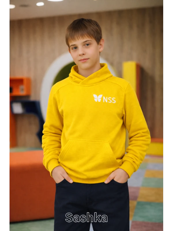 Худі УТЕПЛЕНЕ для хлопчика на флісі з коміром жовте з логотипом школи NSS, розмір 116-164