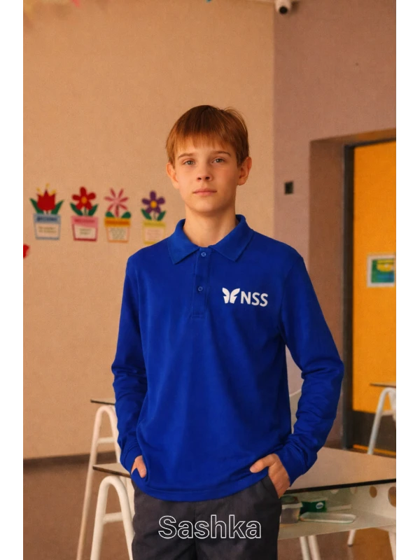 Поло для хлопчика з довгим рукавом синій з логотипом школи NSS, розмір 116-188