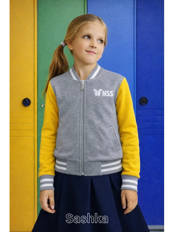 Бомбер на блискавці для дівчинки сіро-жовтий з логотипом школи NSS, розмір 116-158