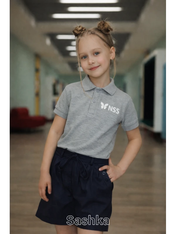 Поло для дівчинки сіре з логотипом школи NSS, розмір 116-188