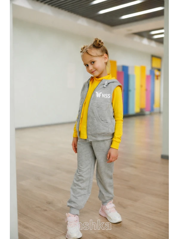 Спортивний костюм трійка для дівчинки світло-сірий з жовтим з логотипом школи NSS, розмір 116-164