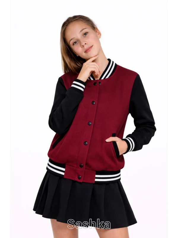 Бордовий бомбер з чорними рукавами утеплений - втілення стилю і комфорту. Модель являє собою скорочену куртку з м'якого трикотажу футер тринитки (Турція) на флісі.