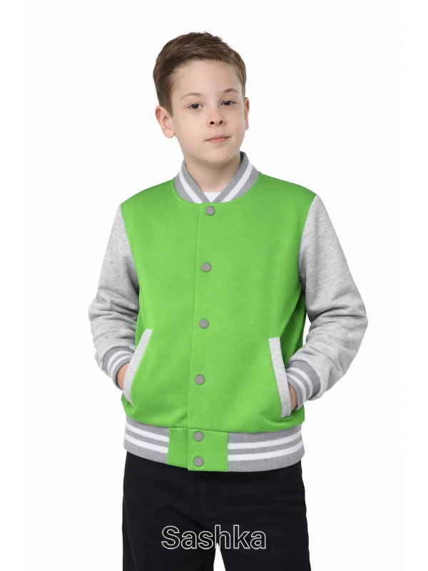 Салатовий бомбер з сірими рукавами - втілення стилю і комфорту. Модель являє собою скорочену куртку з м'якого трикотажу двунитки.
